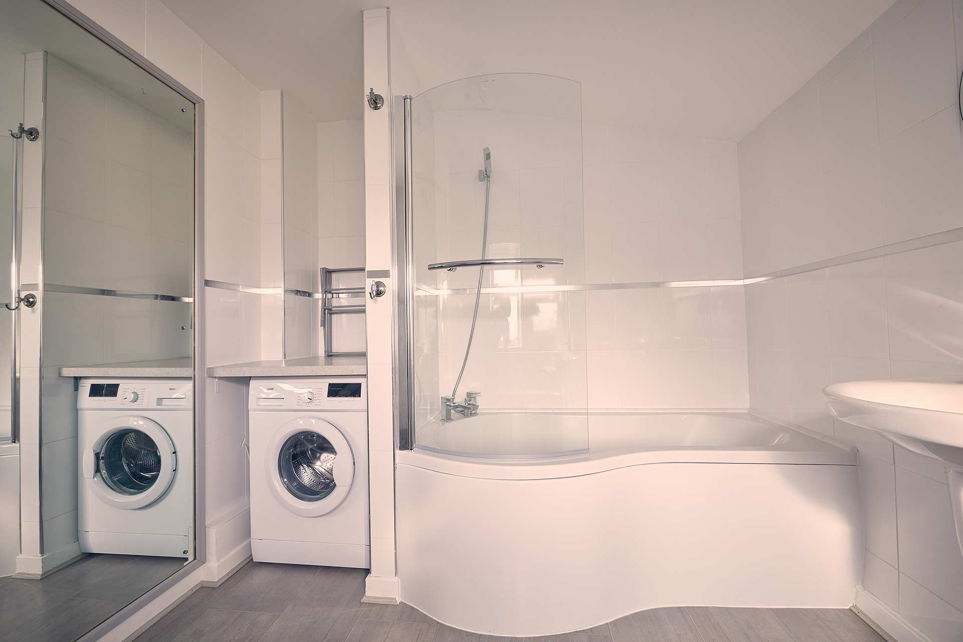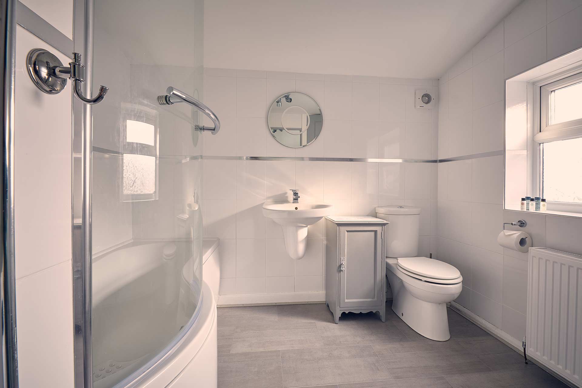 The family bathroom is spacious and clean. The modern suite includes a P shaped bath with overhead shower, basin and WC. There is also a washing machine in this space making it ideal for long self-catering stays.