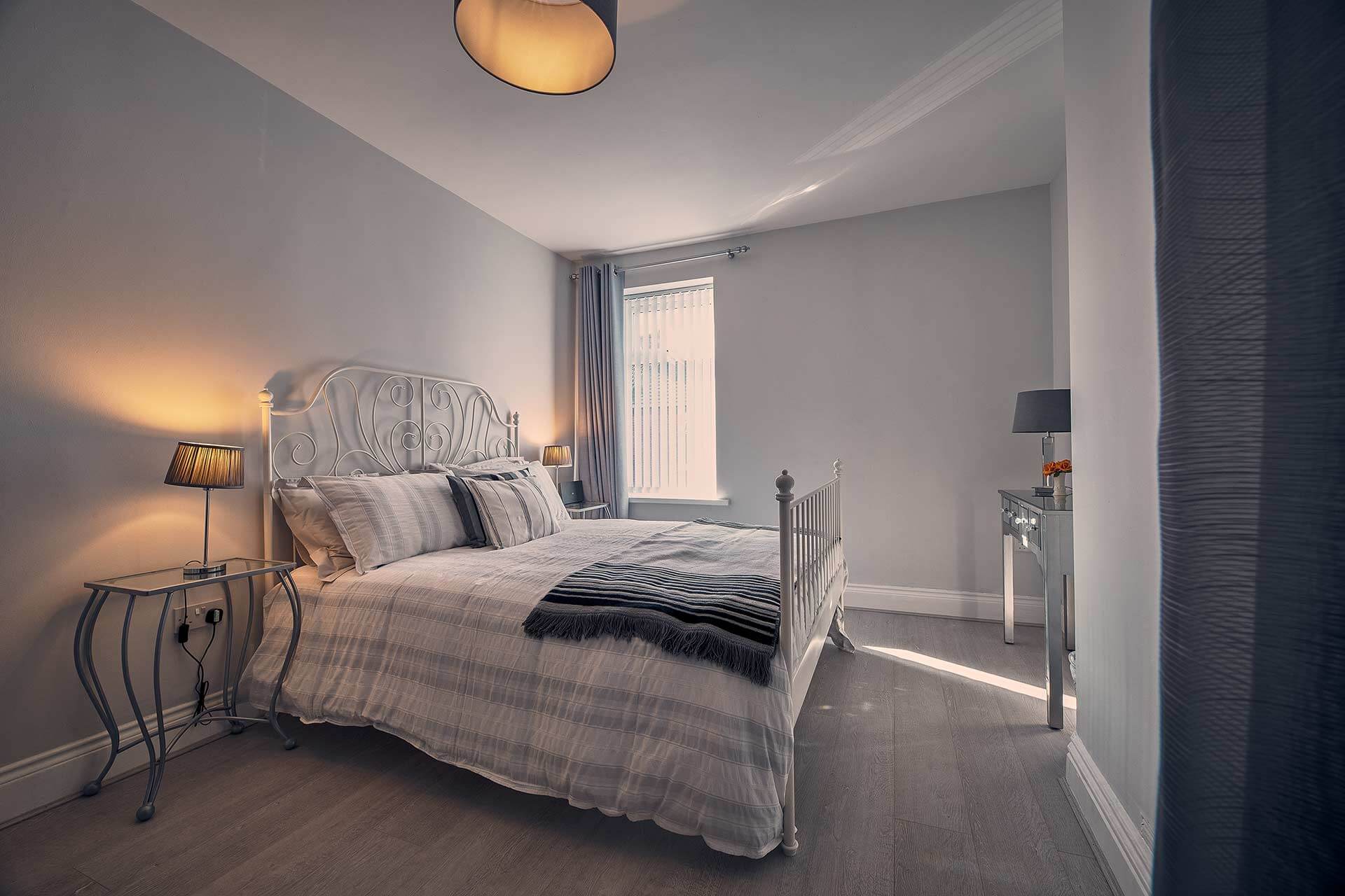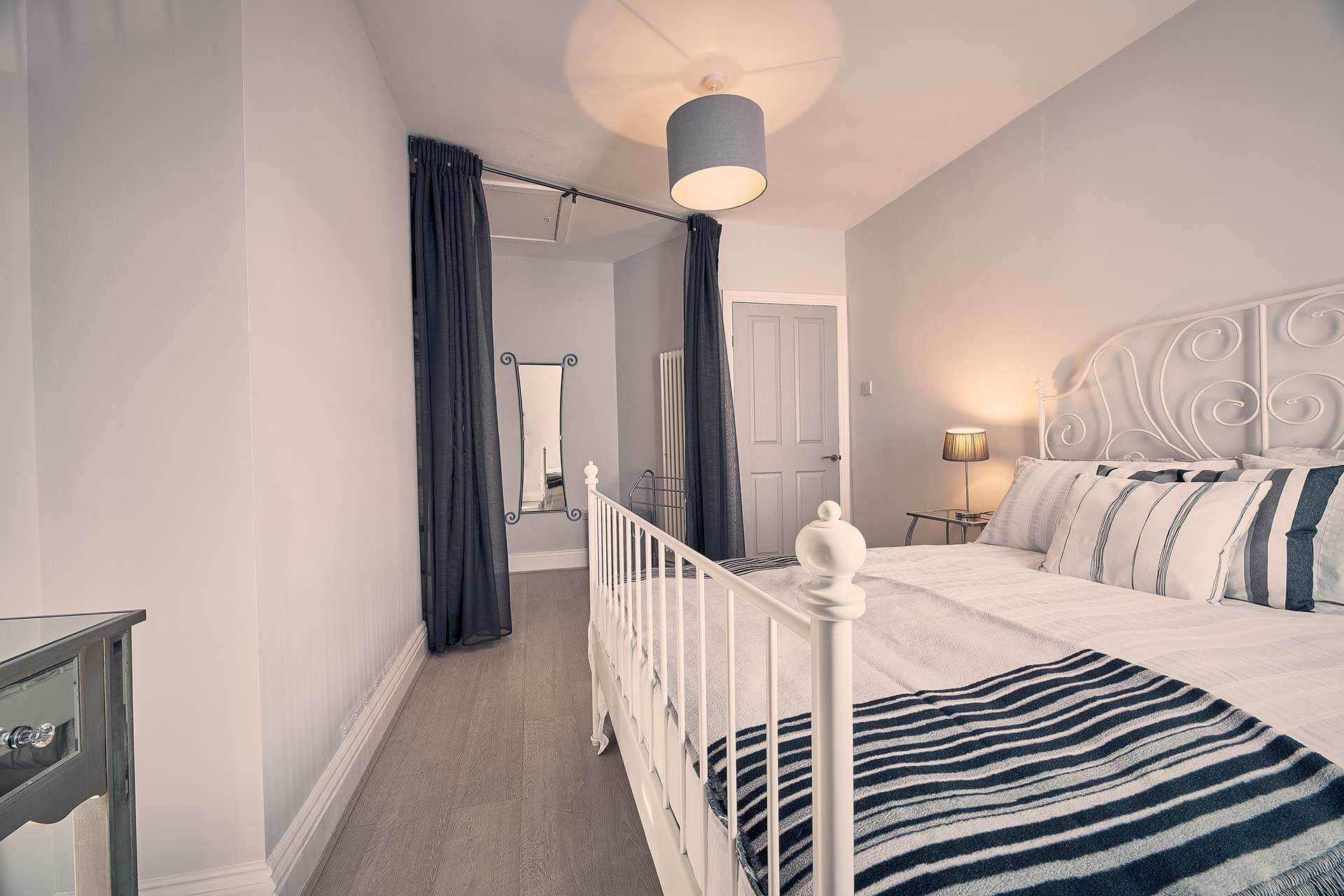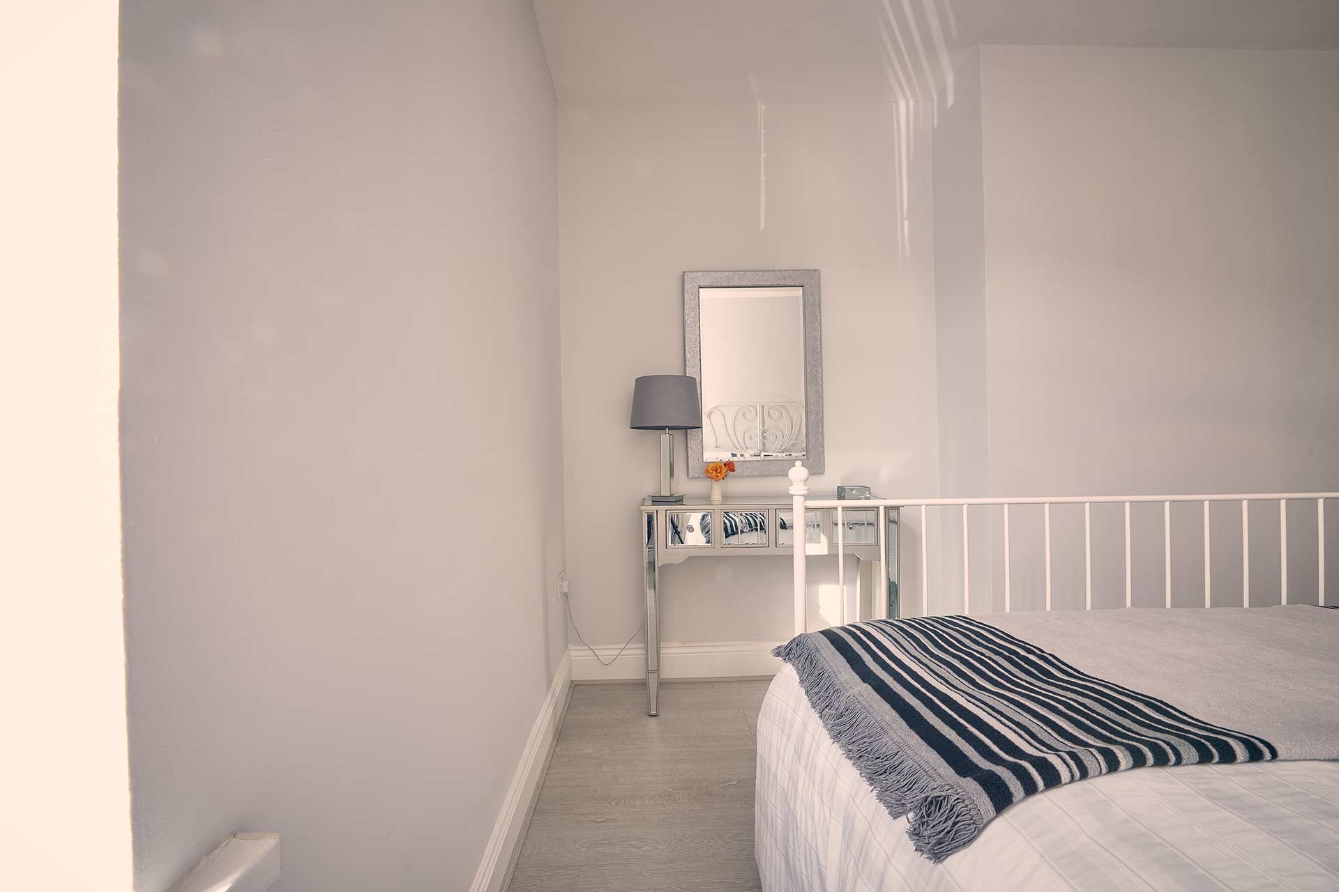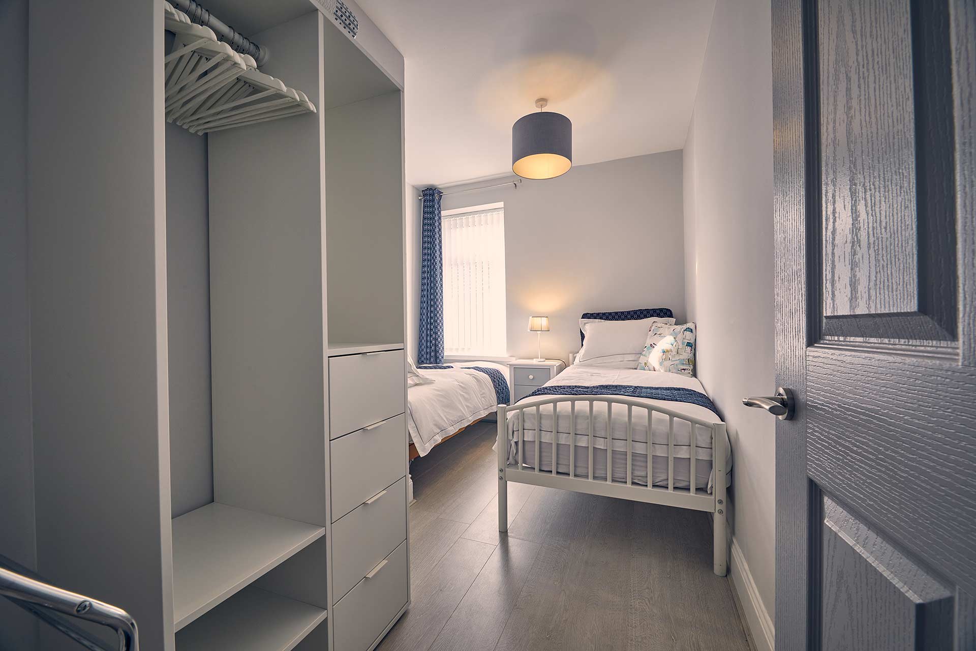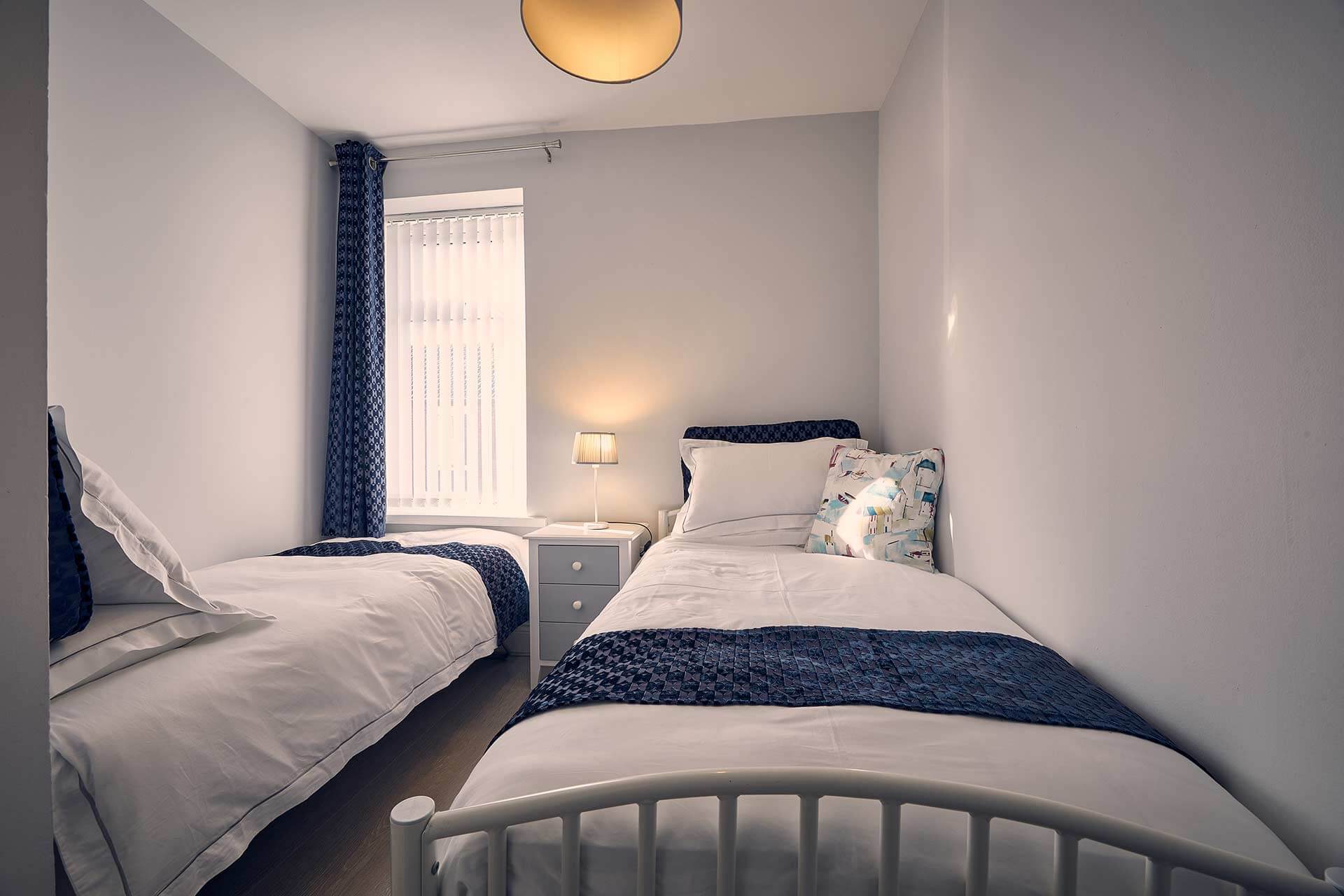 Take the stairs up to the first floor and there are two bedrooms as well as the family bathroom. The first bedroom boasts a comfy, King size bed and a dressing area and the second has twin single beds and compact storage. Both rooms have premium bedding and linens so you can be assured of a restful nights sleep at Roselyn. A travel cot is also available.